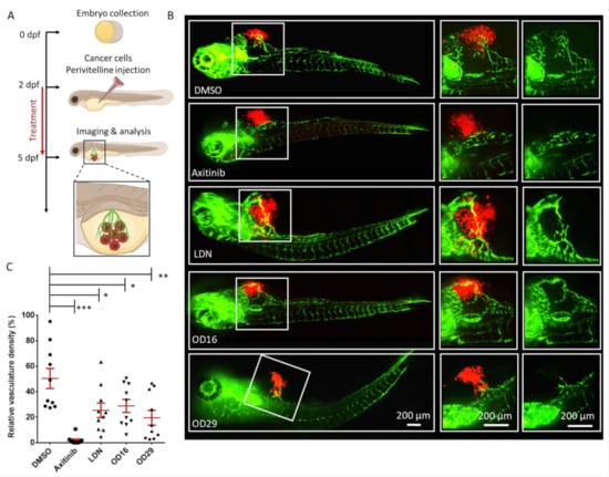 OD16 and OD29 inhibit vessel invasion in a breast cancer xenograft model in zebrafish. (A) Schematic representation of the experimental procedure. Two dpf zebrafish embryos were injected with mCherry (red) labeled human MDA-MB-231 breast cancer cells in the perivitelline space. The injected zebrafish embryos were challenged with testing compounds in egg water for 3 days, and the newly formed vessels within the perivitelline were analyzed. (B) Representative images of the eGFP expressing blood vessels (green) and mCherry MDA-MB-231 cells (red) after treatment of the zebrafish embryos with vehicle control (DMSO), Axitinib, LDN-193189, OD16, or OD29 (0.5 µM) for 3 days. The medium (vessels and tumor cells are visualized) and right panels (only vessels are visualized) represent high magnification views of the area, indicated by white rectangles in the overviews (left panel) images. Scale bars represent 200 µm. (C) Quantification of the relative vasculature density induced by the injected MDA-MB-231 cells within the perivitelline space of the zebrafishes in each group. * p < 0.05, ** p < 0.005, *** p < 0.001.