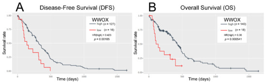 Survival analysis of low and high WWOX expression cut-off through Evaluate Cutpoints. (A) Disease-free survival (DFS). (B) Overall survival (OS).