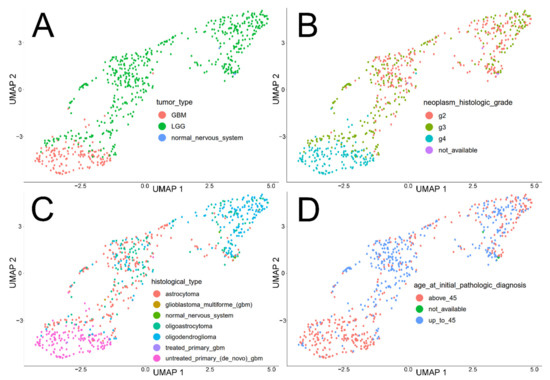 Together with their corresponding normal brain tissue, the GBM and LGG cohorts were distributed across Uniform Manifold Approximation and Projection (UMAP) dimensions using the 1898 genes from GSEA. Out of eight characteristics acquired from The Cancer Genome Atlas (TCGA) clinical data, half showed promising distribution. First, samples were divided on the basis of the tumor_type; normal brain samples were also included to allow simultaneous visualization with tumor samples using one variable (Figure 2A). Subsequently, samples were grouped according to neoplasm_histologic_grade (Figure 2B) and histological_type (Figure 2C), and finally age_at_initial_pathologic_diagnosis divided by median age (Figure 2D). The remaining clinical features (excluded from further analyses due to the lack of a clear pattern) are presented in Figure S1.