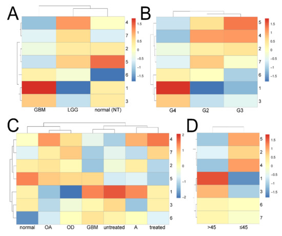 The heatmaps were elaborated to split 1898 genes into modules and ease interpretation of specific comparison. The content of the modules is summarized in Supplementary File S2. Representative modules were selected on the basis of the contrasting pattern between the groups and the level of change in expression. For tumor_type (Figure 3A), the GBM was distinguished from normal brain (abbreviated NT) using modules 5 and 6. Module 1 was chosen to explain the differences between LGG and NT. GBM and LGG demonstrated different patterns for all modules; hence, two sets were adopted for independent examination—the first set comprised modules 2, 4, 5, and 7 combined together, while the second contained modules 1, 3, and 6. For neoplasm_histologic_grade (Figure 3B), the G4 vs. G2 or G4 vs. G3 comparisons were explained using sets of modules 2 + 4 + 5 + 7 and 1 + 3 + 6. Regarding histological_type (Figure 3C), we focused on the most drastic changes: the set of modules 1 + 5 + 7 allowed astrocytoma (A) to be distinguished from both oligoastrocytoma (OA) and oligodendroglioma (OD). Additionally, using combined modules 1, 4, 5, and 6, the following comparisons were also included to identify treatment-related differences: (1) glioblastoma_multiforme combined with untreated_primary_gbm vs. normal_nervous_system; (2) glioblastoma_multiforme combined with untreated_primary_gbm vs. treated_primary_gbm; (3) treated_primary_gbm vs. normal_nervous_system. Lastly, for age_at_initial_pathologic_diagnosis, we indicated two sets of modules (1 + 3 and 2 + 4 + 5) that demonstrated opposite expression profile (Figure 3D). Henceforth, sets will be referred to as module numbers linked with “+”.