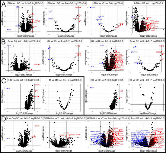 For GBM vs. LGG comparison, 16 DEGs were identified through 1 + 3 + 6 and 2 + 4 + 5 + 7 sets; of these, 11 genes were upregulated and 5 were downregulated. The 5 + 6 set of GBM vs. NT comparison indicated 7 DEGs with log2FC = 1 (3 up- and 4 downregulated), while module 1 of LGG vs. NT comparison determined 19 genes having log2FC > 3.5, with the vast majority being upregulated. The results for tumor_type are presented in Figure 4A. Secondly, three comparisons for neoplasm_histologic_grade (G4 vs. G2; G4 vs. G3; G3 vs. G2) were visualized through the 1 + 3 + 6 and 2 + 4 + 5 + 7 sets, resulting in six independent graphs. Altogether, more than 40 DEGs were selected, as summarized in Figure 4B. Subsequently, the 1 + 3 set indicated four DEGs between groups of age_at_initial_pathologic_diagnosis (Figure 4C). Concerning histological types, astrocytoma differed from both oligoastrocytoma and oligodendroglioma in terms of only three genes of set 1 + 5 + 7 with log2FC > 2.5. The remaining comparisons for this clinical feature revealed several dozen DEGs between the specific GBM phenotype vs. normal brain, and a few ones between treated (Tr.) or untreated (Untr.) high-grade gliomas based on the 1 + 4 + 5 + 6 set (Figure 4D).