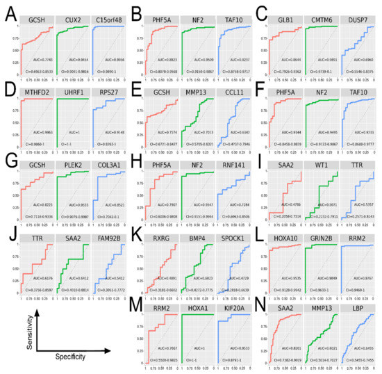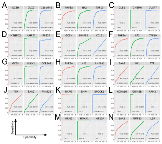ROC analysis of top genes from comparisons—RNA-seq data. (A) GBM vs. LGG, set 1 + 3 + 6. (B) GBM vs. LGG, set 2 + 4 + 5 + 7. (C) GBM vs. NT, set 5 + 6. (D) LGG vs. NT, set 1. (E) G4 vs. G3, set 1 + 3 + 6. (F) G4 vs. G3, set 2 + 4 + 5 + 7. (G) G4 vs. G2, set 1 + 3 + 6. (H) G4 vs. G2, set 2 + 4 + 5 + 7. (I) G3 vs. G2, set 1 + 3 + 6. (J) A vs. OA and OD, set 1 + 5 + 7. (K) Untr GBM vs. Tr, set 1 + 4 + 5 + 6. (L) Untr GBM vs. NT, set 1 + 4 + 5 + 6. (M) Tr vs. NT, set 1 + 4 + 5 + 6. (N) >45 vs. ≤45, set 1 + 3.