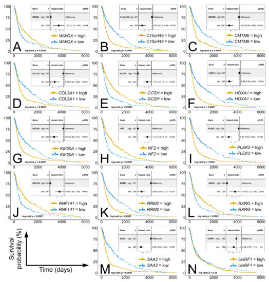 Prior to focusing on the best nine explanatory genes, we correlated all top genes with WWOX to select subsidiary genes more related to WWOX but with slightly worse predictive properties. As forecasted, among all top genes (Table 3), and besides nine predictors, there were a few additional genes worth considering, e.g., COL3A1, KIF20A, RNF141, and RXRG. This resulted in a total of 13 genes that were then subjected to survival analysis, together with WWOX (Figure 7). Kaplan–Meier curves revealed that despite being at the forefront, UHRF1 was not found to be of prognostic importance and was excluded (Figure 7N).