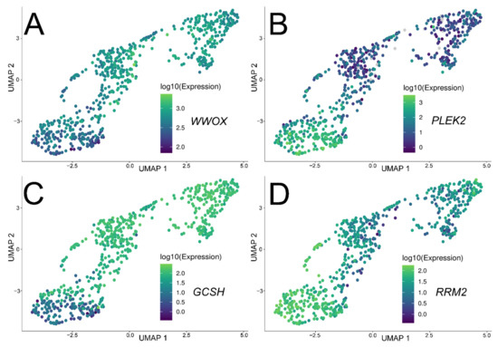 The remaining 12 genes were visualized in terms of their expression across all RNA-seq samples. The selection of three the most relevant genes was based on their predictive value (AUC), effect on survival (DFS), correlation with WWOX, and transparency of expression difference across UMAP dimensions. These were found to be PLEK2, RRM2, and GCSH. Together with WWOX, their expression difference across UMAP is visualized in Figure 8; the same for the remaining genes can be found in Figure S2.