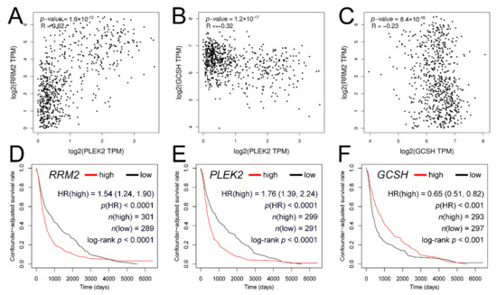 Correlation analysis of PLEK2, RRM2, and GCSH and its confounder-adjusted survival curves. (A) PLEK2 vs. RRM2. (B) PLEK2 vs. GCSH. (C) GCSH vs. RRM2. (D) ESTIMATE-adjusted survival for RRM2. (E) ESTIMATE-adjusted survival for PLEK2. (F) ESTIMATE-adjusted survival for GCSH.