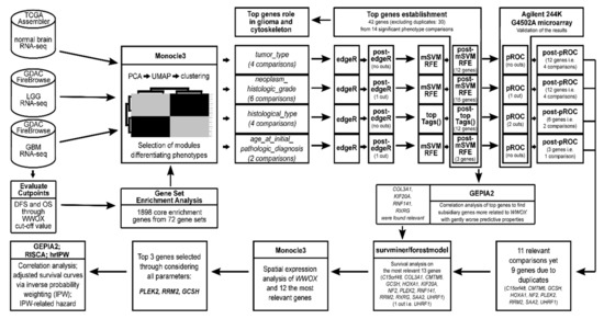 The main research milestones were (1) acquisition of a list of core enrichment genes using Evaluate Cutpoints and GSEA; (2) selection of the most important clinical features and comparisons using Monocle3; (3) establishment of the top genes and determining their role in the context of glioma and/or cytoskeleton; (4) validation of the results and selection of the three most relevant genes based on their predictive properties (AUC), impact on patients survival (DFS), correlation with WWOX, and transparency of spatial expression analysis across UMAP dimensions. Performing the edgeR → mSVM-RFE → ROC workflow independently for each clinical feature is justified, since the final verdict (indicating the most relevant gene) depended on the analyzed trait. Moreover, additional correlation analysis between the top genes and WWOX identified four important genes; likewise, multiple testing of the top genes allowed us to spot overfitted genes.