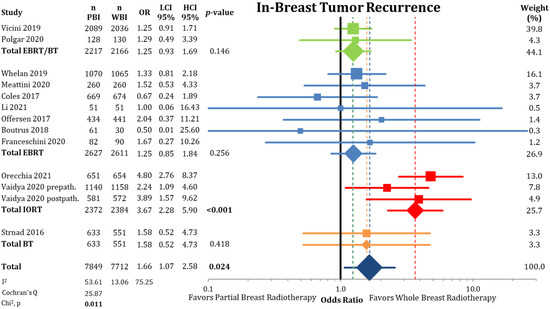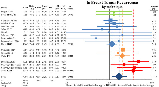 Comparison of in-breast tumor recurrences between partial-breast radiotherapy and whole-breast radiotherapy. The odds ratios for each trial grouped by radiation technique and the pooled effect sizes with corresponding 95% confidence intervals are reported. The squares represent the effect sizes of the individual trials, while the center of the diamonds indicate the pooled odds ratios for the individual techniques and the overall effect. Heterogeneity analysis is shown using the I2 with 95% confidence intervals and Cochran’s Q analysis. Bold p-values indicate statistically significant results.