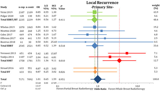 Numerous meta-analyses and systematic reviews have been published on this subject since 2010 [105,106,107,108,109,110,111,112,113,114]. The number of included patients and follow-up time limited earlier analyses [105,106,107,108,109,110,111]. Newer publications either lack the inclusion of larger recently published trials [112] or excluded the three randomized trials performing PBI with IORT [114]. The report published by Viani and colleagues reported similar results to ours; however, a strength of our analysis is the detailed assessment of local relapse with localization and distribution in addition to a high number of included patients (n = 15,661) [113].