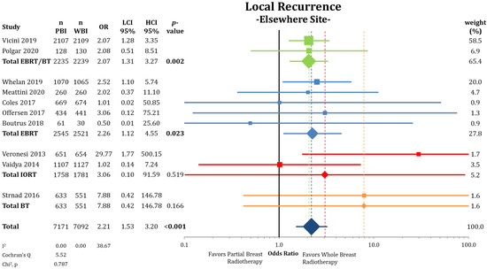 Controlling for different lengths of follow-up, Table 2 shows the five-year IBTR rates separated by the PBI technique. Overall, at the five-year IBTR time point, PBI was not statistically different to WBI (2.47% vs. 1.46%; OR = 1.61 CI-95%: 0.97–2.66; p = 0.066). As shown, the analysis detected significant heterogeneity between the trials (p = 0.028). PBI using IORT showed significantly worse IBTR rates at five years (3.07% vs. 0.90%; OR = 3.39 CI-95%: 1.64–7.00; p = 0.001), comparing unfavorably to the other PBI techniques where no differences between PBI and WBI were detectable (EBRT/BT: 2.76% vs. 2.32%; EBRT: 1.7% vs. 1.41%; BT: 1.57% vs. 1.02%).