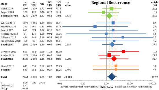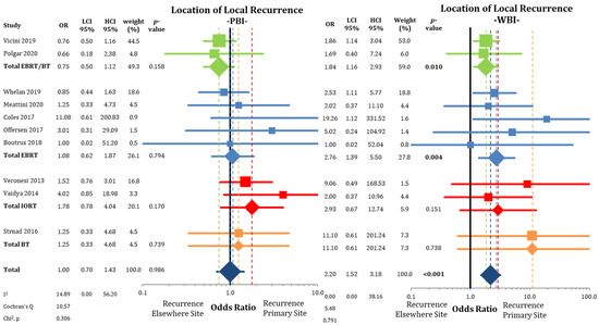 Assessment of regional recurrences between partial-breast radiotherapy and whole-breast radiotherapy. The odds ratios for each trial (squares) grouped by radiation technique and the pooled effect sizes (diamonds) with corresponding 95% confidence intervals are displayed. Bold p-values indicate statistically significant results.