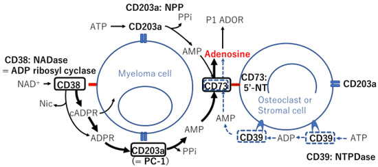 The MM BMM includes high levels of extracellular nucleotides, such as adenosine triphosphate (ATP) and NAD+, which are converted to adenosine in reactions catalyzed by cell surface proteins called ectoenzymes (Figure 1) [37]. Adenosine is a nucleotide generated under metabolic stress, such as hypoxia, and acts to regulate inflammation and immune responses [38]. Extracellular ATP is hydrolyzed by the nucleoside triphosphate diphosphohydrolase CD39 to adenosine diphosphate (ADP) and then adenosine monophosphate (AMP) via the canonical adenosinergic pathway or directly via the low-affinity nucleotide pyrophosphate/phosphodiesterase (NPP) CD203a (originally identified as PC-1 [39]) (Figure 1). AMP is hydrolyzed by a 5′-nucleotidase (5′-NT), also known as NPP CD73, to generate adenosine, a potent immunosuppressor molecule. ATP is involved in the adenosinergic canonical pathway through CD39/CD73 tandem molecules on different cell surfaces (Figure 1). However, the optimal pH at which the enzyme CD39 is active is in the alkaline range of 8–8.2. The efflux of lactic acid and H+ induces lactic acidosis and consequently generates an acidic tumor microenvironment (TME; pH < 6.5). In contrast, the noncanonical adenosinergic pathway involves three ectoenzymes, i.e., CD38 (an NAD+-glycohydrolase (NADase), also known as ADP ribosyl cyclase), CD203a, and CD73 (Figure 1) [40]. In the hypoxic TME, more NAD+ and H+ are produced in the BMM, and NAD+ is therefore prone to metabolism via the noncanonical pathway in the MM BMM.