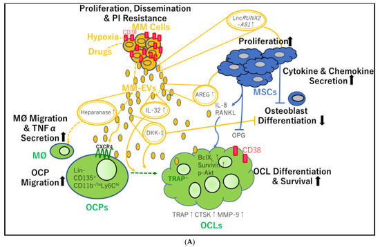 Osteoclasts in MM are derived from monocytes [53] and MDSCs [54]. Using murine peritoneal RAW264.7 macrophages as osteoclast precursors, treatment with human recombinant RANKL confirmed the presence of tartrate-resistant acid phosphatase (TRAP)-positive multinucleated osteoclasts [55]. In these experiments, the number of TRAP-positive multinucleated osteoclasts increased significantly in the presence of MM cell-derived exosomes (MM-exos). Moreover, MM-exos contributed to osteoclast migration by increasing CXCR4 expression in vitro and promoted the modulation of osteoclast differentiation by increasing the levels of the anti-apoptotic proteins B cell lymphoma-extra-large (Bcl-XL) (also known as BCL-2-like 1), survivin, and phosphorylated AKT (Figure 2A). As a result, MM-exos induced RAW264.7-derived osteoclasts, which exhibited authentic bone resorption lacunae in the dentine substrate. MM-exos regulated osteoclast bone reabsorption by increasing the expression of key osteoclastogenic enzymes, such as TRAP, cathepsin K, and matrix metalloproteinase-9 [55] (Figure 2A).