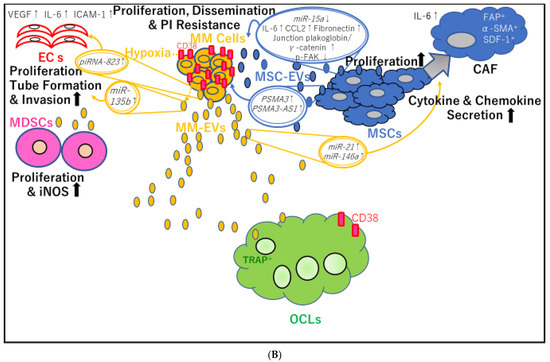 Carrying high levels of miR-21 and miR-146a, exosomes derived from OPM-2 MM cells were found to promote MSC proliferation via increased miR-21 and miR-146a expression in MSCs. Furthermore, CAF transformation was induced as a result of increased mRNA expression of CAF markers, including fibroblast-activating protein, α-smooth-muscle actin, and stromal-derived factor 1, as well as enhanced IL-6 secretion [25] (Figure 2B).