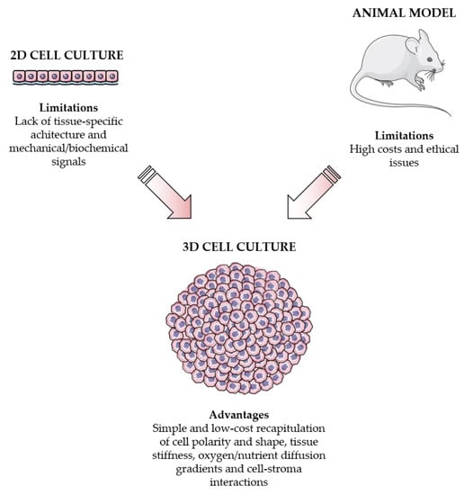 2D cell cultures and animal models vs. 3D cell cultures. On one hand, 2D monolayers do not retain the tissue-specific structure and mechanical/biochemical properties. On the other hand, in vivo models are very expensive and associated with ethical issues. Importantly, 3D systems can overcome these limitations by accurately reproducing cell polarity and shape, tissue stiffness, oxygen/nutrient diffusion gradients and cell-stroma communication.