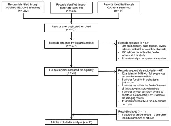 Of the 681 articles identified by the search strategies, 597 articles were found after removing duplicate articles, and 521 articles were further excluded based on titles and abstracts (Figure 1). Sixty-seven articles were excluded during a full-article review. Specifically, studies reporting the performance of AMRI, but those conducted in the retrospective diagnostic cohorts were excluded [19,20,21,22,23,24,25]. In search of the bibliographies, we found one additional eligible article. Finally, a total of 10 eligible articles reported the diagnostic performance of AMRI in HCC surveillance [11,12,13,26,27,28,29,30,31,32].