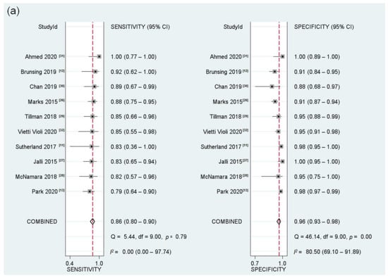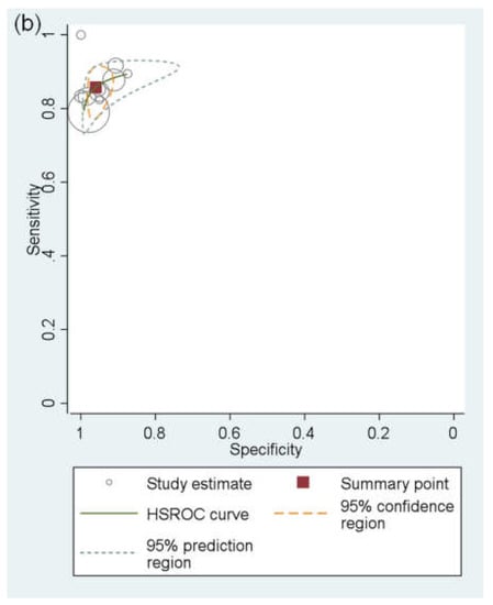 - Macaskill, P.G.C.; Deeks, J.J.; Harbord, R.M.; Takwoingi, Y. Chapter 10: Analysing and Presenting Results. In Cochrane Handbook for Systematic Reviews of Diagnostic Test Accuracy; Deeks, J.J., Bossuyt, P.M., Gatsonis, C., Eds.; Version 1.0.; The Cochrane Collaboration: London, UK, 2010; Available online: http://srdta.cochrane.org/ (accessed on 29 February 2021).