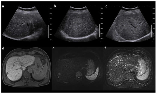 A 64-year-old man with chronic hepatitis B. (a–c) Surveillance ultrasonography does not show any focal hepatic lesion, whereas (d–f) surveillance AMRI shows a 1.5 cm nodule in segment VII. Ultrasonography shows coarse echotexture of the liver (a), but it shows no focal hepatic lesion on the right lobe upper view (b) and lower view (c). The nodule has hypointensity on the hepatobiliary phase image (d), restriction on the diffusion-weighted image (e), and moderate hyperintensity on the T2-weighted image (f). The surveillance AMRI enabled us to make a diagnosis of HCC.