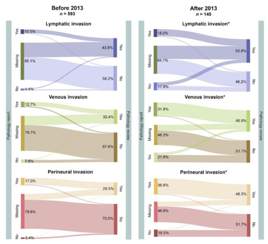 In general, missing data on specific features are grouped under negative or absent [13]. We showed that this assumption is false. After review, 19.5% to 32.8% of all cases showed the presence of venous and lymphatic invasion, respectively, whereas these items were absent from the report. In contrast, for perineural invasion, most missing cases corresponded to the actual absence of this feature. Thus, it seems that the presence of perineural invasion is more notable than vascular invasion.