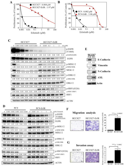 The epithelial-mesenchymal transition (EMT) has been reported to be associated with drug resistance (for review, [43]). Although HCC827 cells expressed the epithelial cell marker E-cadherin, HCC827-ErlR cells expressed mesenchymal cell markers such as vimentin and N-cadherin (Figure 1E), indicating that HCC827-ErlR cells underwent the EMT. In addition, HCC827-ErlR cells highly expressed AXL receptor tyrosine kinase compared with HCC827 cells. As expected, HCC827-ErlR cells exhibited a higher migration and invasion capacity than HCC827 cells (Figure 1F,G).