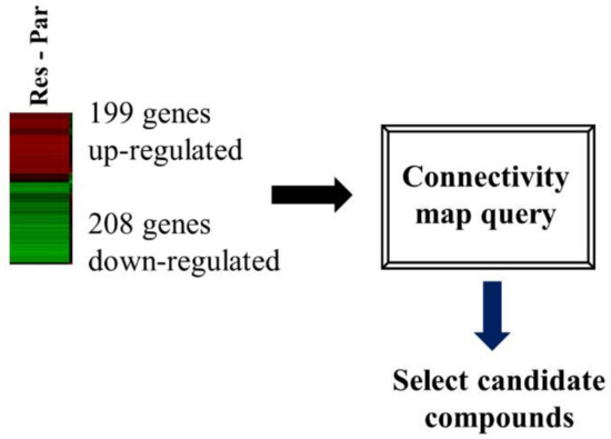 For the CMap build 02 analyses, the DEGs (Tables S1 and S2) from HCC827 and HCC827-ErlR cancer cell lines were determined using the FPKM RNA_seq raw data. The cutoff criteria for DEGs were set to log2(FC) > 2.0 and log2(FC) < −2.7. DEG files were prepared using an in-house script (https://github.com/a00101/convert_GRP, 4 December 2017). Then, these probe sets were queried according to the instructions. These DEGs (Grp files) were directly inputted into the Broad Institute website (https://portals.broadinstitute.org/, 4 December 2017). The ranking was determined based on the similarity of the perturbagen signature to the query signature.