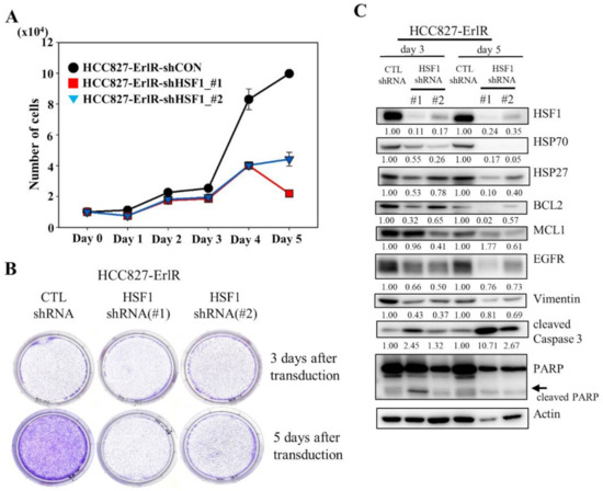 The shRNA-mediated knockdown of HSF1 inhibits the proliferation and colony formation of HCC827-ErlR cells. (A) HCC827-ErlR cells were transduced with lentivirus carrying shRNA targeting HSF1 (#1 or #2) or control shRNA. Twenty-four hours after transduction (day 0), cells were counted using a microscope on the designated days. (B) Representative images are shown of colonies formed by HCC827-ErlR cells transduced with control shRNA, HSF1 shRNA (#1), or HSF1 shRNA (#2) after 3 or 5 days of transduction. (C) HCC827-ErlR cells were transduced with control shRNA, HSF1 shRNA (#1), or HSF1 shRNA (#2), and whole cell lysates were prepared 3 and 5 days after transduction. Expression of HSF1 or its downstream proteins was analyzed by Western blotting using the indicated antibodies (protein band intensity was normalized to the actin band intensity).