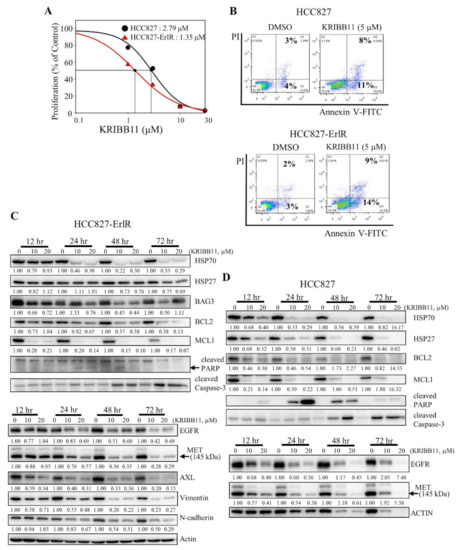 3.4. KRIBB11 Downregulates EGFR (T790M), AXL, MET, HSP70, HSP27, BAG3, and MCL1 in NCI-H820 and PC9-ErlR Cells