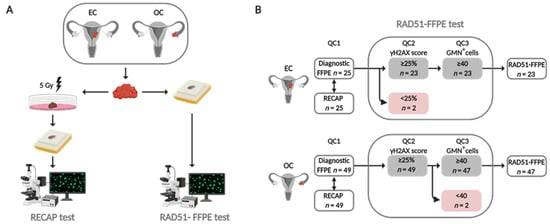 From RECAP to RAD51-FFPE test. (A) EC and OC tumor specimens obtained during surgery were used for both the RECAP test (left) and RAD51-FFPE test (right). The RECAP test requires ex vivo irradiation of fresh tumor specimens (5 Gy) and incubation prior to tissue fixation. The RAD51-FFPE test is performed directly on (archival) diagnostic FFPE specimens. (B) Diagnostic FFPE specimens matched with RECAP specimens that were previously published [31,41] were subjected to a three-step quality control (QC). First, diagnostic FFPE specimens with >70% tumor tissue were included (QC1). Second, the γH2AX score based on the percentage of γH2AX+/GMN+ (≥ 2 foci) cells was calculated (QC2). If this score was ≥ 25%, specimens were analyzed with a co-IF for the presence of GMN and RAD51. If ≥ 40 GMN+ cells could be counted, the RAD51-FFPE specimen was included for analysis (QC3). Abbreviations: EC = endometrial carcinoma; OC = ovarian carcinoma; RECAP = REcombination CAPacity; FFPE = formalin-fixed paraffin-embedded; GMN = geminin.
