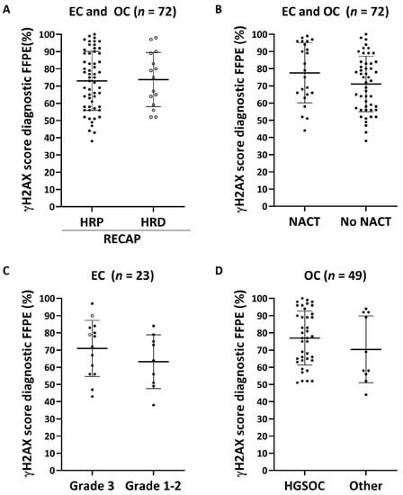 For all cases that were previously analyzed by the RECAP test, a diagnostic FFPE specimen with more than 70% tumor tissue could be selected (QC1) (Figure 1B). In contrast to the RECAP test, the RAD51-FFPE test requires sufficient levels of endogenous DNA damage in tumor cells to allow evaluation of HR function by analyzing RAD51 protein accumulation at sites of DNA damage (Figure 1A) [41]. To detect endogenous DNA damage in tumors cells, we developed a co-IHC staining protocol for γH2AX/GMN (Figure S1). The γH2AX score, i.e., the percentage of GMN+ cells with more than two γH2AX foci/nucleus, was determined for each case. When applying a 25% γH2AX threshold, as described previously [42,43,44], 72/74 (97%) passed QC2 (Figure 1B and Figure 2). We investigated whether differences could be observed between γH2AX scores of diagnostic FFPE specimens when cases were classified as either HR-Proficient (HRP) or HR-Deficient (HRD) based on the results of the RECAP test (RECAP-HRP and RECAP-HRD; Figure 2A and Figure S3). The average γH2AX score of all RECAP-HRP EC and OC specimens (73% (range 38–100%)) was comparable to the average γH2AX score of all RECAP-HRD EC and OC specimens (74% (range 52–98%, p = 0.884) (Figure 2A). No differences in γH2AX scores were observed between EC RECAP-HRP and RECAP-HRD cases (p = 0.322) (Figure S3A), nor in OC RECAP-HRP and RECAP-HRD cases (p = 0.638) (Figure S3B). Next, we explored whether NACT treatment or tumor grade could affect the γH2AX score. EC and OC tumor specimens obtained from patients who were treated with NACT did not yield higher γH2AX scores, (p = 0.123) (Figure 2B). In addition, γH2AX scores were not related to tumor grade or the presence of a TP53 mutation in EC (p = 0.274 and p = 0.549, respectively) (Figure 2C) nor to histologic subtype in OC (p = 0.269) (Figure 2D).