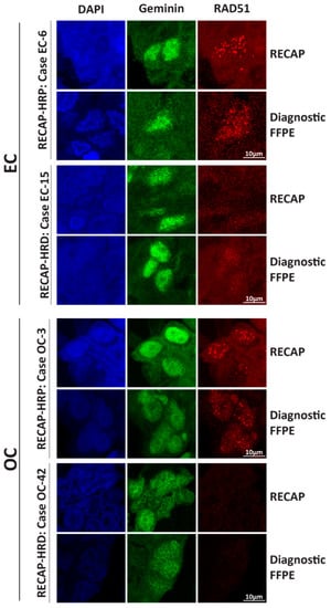 Microscopy illustration of RECAP versus RAD51-FFPE IF stained slides of EC and OC. Tumor specimens were stained for geminin, a marker for the G2/S phase, and RAD51 (Diagnostic FFPE: geminin-Novocastra and RAD51-Abcam; RECAP: geminin-ProteinTech and RAD51-GeneTex) (Table S1). Case numbers correspond with case numbers in de Jonge et al. and van Wijk et al. [31,41]. Abbreviations: EC = endometrial carcinoma; OC = ovarian carcinoma; RECAP = REcombination CAPacity; FFPE = formalin-fixed paraffin-embedded; HRP = homologous recombination proficient; HRD = homologous recombination deficient.