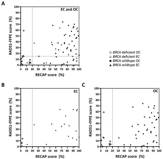 Correlation RAD51-FFPE scores with RECAP scores in EC and OC. RECAP scores were calculated as the percentage of GMN+ cells with ≥5 RAD51 foci. RAD51-FFPE scores were calculated as the percentage of GMN+ cells with ≥2 RAD51 foci. The 20% HRD threshold for HR classification of RECAP specimens is indicated with a dotted vertical line. RAD51-FFPE scores significantly correlated with RECAP scores for EC and OC combined (A) (n = 70; Pearson R2 = 0.20, p = 0.0001), for EC (B) (n = 23; Pearson R2 = 0.22, p = 0.025) and for OC (C) (n = 47; Pearson R2 = 0.19, p = 0.0023). One OC case (OC-45) with a pathogenic variant in BRCA1 and classified as HRD by the RECAP test (RECAP score 5%) was a clear outlier in our study, as it had a RAD51-FFPE score of 59%. Details for this case can be found in Table S5. Abbreviations: EC = endometrial carcinoma; OC = ovarian carcinoma; RECAP = REcombination CAPacity; FFPE = formalin-fixed paraffin-embedded; GMN = geminin; BRCA deficient = cases with pathogenic variants in BRCA1/2 or BRCA1 promotor hypermethylation.