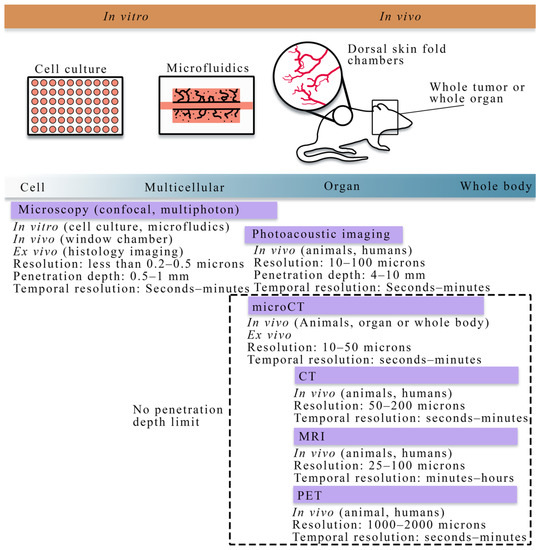 At the cellular scale, microscopy is the dominant imaging technique for providing quantitative measurements of tumor vasculature with a spatial resolution on the order of microns. Confocal microscopy, combined with immunofluorescence staining, has been used to acquire high resolution, temporally resolved images of vascular structure in angiogenic and vasculogenic assays [34,35,36]. This technology allows for analyzing in vitro spatial distributions of fluorescently labeled cell lines and can be coupled with fluorescing microspheres to investigate vascular integrity, enabling the integration of quantitative fluorescence measurements with mathematical modeling. Furthermore, confocal microscopy has also been utilized in vivo to investigate functional microcirculation [37] in tumor-associated vasculature, the effects of radiotherapy [38] on neovasculature, and the oxygen distribution [39,40] in dorsal skin fold chambers [41]. While intravital microscopy provides a high-resolution longitudinal analysis in vivo, the chamber may alter the tumor-vasculature dynamics and it is fundamentally limited in the length of study (generally 2–3 weeks), and the number of imaging time points. Multiphoton microscopy [42], in comparison to confocal microscopy, has improved depth penetration and confines excitation to the focal plane of the lens, thereby decreasing the photodamage to the tissue. For many biological applications, tissue depths of ~500 microns can be imaged over time [42].