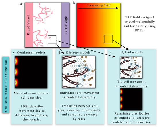 Mathematical models of tumor angiogenesis vary in the extent of biological detail they characterize and can be summarized as discrete (treating endothelial cells and vasculature as individual objects), continuous (treating endothelial cells or vasculature as concentrations), or hybrid (combining methodology from both discrete and continuum theory) models. Discrete models may track all endothelial cells as individual agents, or simply tip endothelial cells or TECs (the cells responsible for directed migration in response to chemical stimuli). In discrete models, the vasculature changes through time based on sets of rules dictating cell behavior (e.g., whether a cell will divide or migrate). Continuum models are based on ordinary or partial differential equations (PDEs) that govern the behavior of the endothelial cells through time. Hybrid models couple these two theories by, for example, discretely characterizing the TECs and continuously modeling the overall vessel morphology through a PDE. We note that while hybrid models could refer to models that have a discrete and continuous component within the modeling framework (which would dictate a hybrid modeling approach), here, we define hybrid as utilizing both discrete and continuous methodologies specifically applied to model the vasculature. The reader is invited to refer to Figure 2 throughout this section as it shows examples of these three modeling approaches. All three modeling approaches are typically used to study the migration and development of tumor-associated vasculature in response to external stimuli (e.g., chemical, mechanical) in conjunction with a model of tumor growth. A simulation of the process of angiogenesis typically begins with the stimulation of endothelial cells by tumor angiogenic factors (TAF, a continuous field of pro-angiogenic proteins secreted by tumor cells) that are either explicitly coupled to a model of tumor cell growth or assumed to have a fixed initial distribution. Directed movement of endothelial cells is then influenced by chemical gradients (i.e., TAF), gradients in fibronectin or insoluble extra-cellular matrix (ECM) (i.e., haptotaxis), and mechanical cues (i.e., mechanotaxis) [87,88].