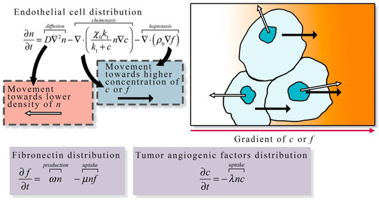 Continuum models (panel c in Figure 2) describe the spatial and temporal development of endothelial cells over time in terms of densities or volume fractions [89,90,91]. These models are capable of capturing macroscopic features related to vasculature, TAF, and ECM but do not track individual cells or vessel segments. In continuum models, the spatial and temporal progression of these model components are described with a set of coupled PDEs. Anderson et al. developed a continuum model of tumor angiogenesis by considering the rate of change of endothelial cell density determined by the sum of the effects of Brownian motion (diffusion), chemical stimuli (chemotaxis), and mechanical forces (haptotaxis) [23]. The chemical stimuli considered was TAF, which caused a migration in endothelial cell density toward the TAF source. In the presence of angiogenic factors, the distribution of endothelial cells migrated across the domain. As Anderson et al.’s model system forms the foundation for numerous other models of angiogenesis, Figure 3 illustrates the proposed model. The same model can be conceptualized as a discrete model by considering the bulk changes in endothelial cell density as discrete events based on probabilities. The authors used a finite difference approximation of the continuous equation for endothelial cell density to determine the probability that endothelial cells move in a particular direction due to diffusion, chemotaxis, and haptotaxis. This work highlighted the potential of both discrete and continuum models to explore the same phenomena.