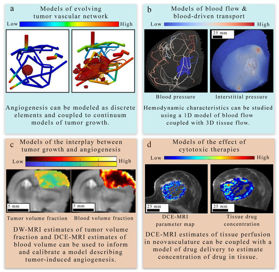 Overview of tissue-scale models of angiogenesis and vasculature. There are four main approaches to modeling tumor-induced angiogenesis and vasculature at the tissue scale level. (Panel a) provides an example of a discrete modeling approach [122,123] used to describe the evolving geometry of tumor vasculature in response to tumor growth. This simulation employs a 3D continuous multi-species tumor growth model coupled to a 1D discrete model of angiogenesis. The tissue domain initially features a small spherical tumor core, which grows in response to the changing vasculature network. The colors in the network show the nutrient volume fraction. (Panel b) displays how the function of existing tumor vasculature in the breast can be studied with computational fluid dynamics [33] to estimate hemodynamic properties of the vascular network. In (panel c), diffusion weighted (DW-) and DCE-MRI acquired in a murine brain tumor model (C6 glioma) are used to provide tumor volume fraction and blood volume fraction estimates to initialize and calibrate a model of tumor-induced angiogenesis. The model derived estimates of tumor and blood volume fraction are overlaid on an axial T2-weighted MRI through the center slice of the tumor. A coupled set of PDEs [32] are used to describe the proliferation, diffusion and death of tumor cells and the angiogenesis, diffusion, and regression of the vasculature. In (panel d), estimates of tissue perfusion in the breast derived from quantitative imaging are coupled with a mathematical model of drug delivery [86] and tumor growth to observe the effect of tumor vasculature on drug distribution and tumor response to treatment. Both the left and right images in (panel d) show quantitative maps of DCE-MRI parameters or drug concentration overlaid on an anatomical image acquired in the same plane. The right drug concentration map is an enlargement of the computational domain.