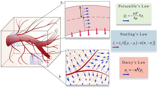 The second area (panel b in Figure 4) focuses on estimating blood flow and transport within the vasculature and through the interstitial space. As described in Section 1, vascular flow has a profound influence on the dynamics of growth and therapeutic response of the tumor [8]. The modeling of vascular flow usually includes a description of flow in the blood vessels, along with its coupling with flow in the tissue through a mass flux at the capillary walls or at the terminal ends of larger vessels. Similar to the cell-scale models reviewed in Section 3, these phenomena can be modeled by discrete [33,87,88,122,123,126,130,131,132], continuous [128,129,133,134], or hybrid [127,135,136] approaches. In discrete vascular models both the pre-existing and the angiogenic vasculature are frequently approximated by a 1D network of connected straight cylinders with the flow in each cylinder simulated using the 1D Poiseuille law [33,87,88,122,123,126,130,131,132]. In continuous vascular flow models the vasculature is described with a spatially averaged, continuous variable (e.g., vasculature density or vascular volume fraction), and the transport of the substance of interest (e.g., drug or nutrient) through the interstitial space is described with a reaction-diffusion-advection model [128,129,133,134] describing the delivery, diffusion, and the transport of that substance due to bulk fluid flow. Hybrid vascular flow models [127,135,136] combine the discrete and continuum approaches; capillaries and smaller vessels are approximated with a continuum approach, whereas the large vessels are explicitly retained, and their flow is simulated as in discrete models. A formative example of blood flow and transport by D’Angelo et al. [131] describes an approach to couple a 1D discrete model of tissue vasculature with a 3D continuum model of interstitial transport. Blood flow through the vessel network follows Poiseuille’s law (which relates flow to vessel radius, pressure, and the viscosity of blood), and transport across the vascular walls is described by Starling’s law (which relates the extravasation rate to vessel permeability and the pressure difference between the vessel and the tissue). Interstitial flow is dictated by Darcy’s law, which relates flow to the pressure gradient and the hydraulic conductivity of the tissue. The approach by D’Angelo et al. allows the unique vasculature network structure to be preserved (and not reduced to a spatially averaged variable) while allowing for a coupling to a 3Dcontinuous model of the interstitial space. Figure 5 shows an illustration of these three foundational relations in modeling intravascular and interstitial flow.