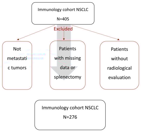 Out of the 405 patients treated with immune checkpoint inhibitors (in the first line or thereafter) for NSCLC between January 2014 and June 2020 in our center, 109 patients were excluded because their CT scans were not amenable to measurement of the spleen because of missing data, technical problems, or splenectomy (Figure 1). In total, the analysis was performed only on 276 patients with complete clinical and radiological information.