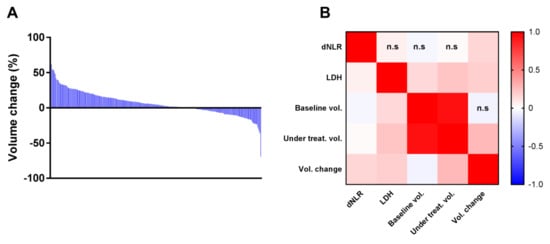 (A) Barplot representing decreasing volume changes for all of the patients. (B) Heatmap showing Pearson correlation matrix coefficients between splenic volumes, dNLR, and LDH measures n.s: non-significant correlation.
