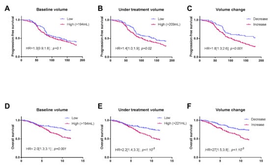The change in splenic volume was also associated with PFS and OS. For PFS, HR = 1.8 (1.3; 2.6); p = 0.001 in the univariate Cox model, and when adjusted for clinical variables, HR = 1.3 (0.8–2.1); p = 0.2. For OS, HR = 2.3 (1.5; 3.8); p < 1.10−3 in the univariate Cox model and when adjusted for clinical variables, HR = 2.1 (1.1–3.8); p = 0.01. (Figure 3C,F).