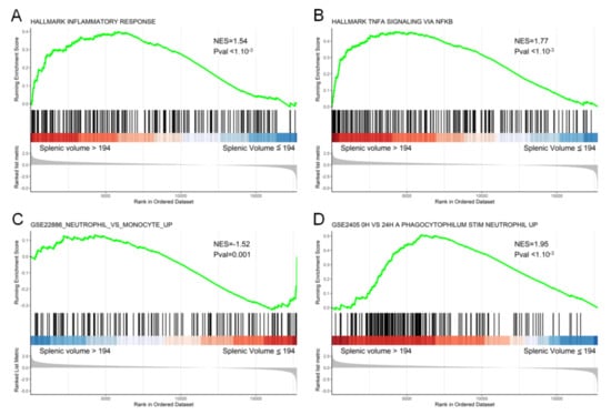 To link this clinical observation with a transcriptomic molecular pattern, we analyzed RNAseq data in a subset of 50 patients included in this cohort. At the immunological level, GSEA analysis showed the significant enrichment of gene sets associated with the inflammatory response for patients with an increase in splenic volume (inflammatory response (p < 1.10−3), phagocytophilum stim neutrophil (p < 1.10−3)). Patients with an increasing splenic volume also significantly over-expressed genes associated with the TNF-alpha signaling pathway (p < 1.10−3) and under-expressed genes associated with the monocyte vs neutrophil pathway (p = 0.001) (Figure 4).