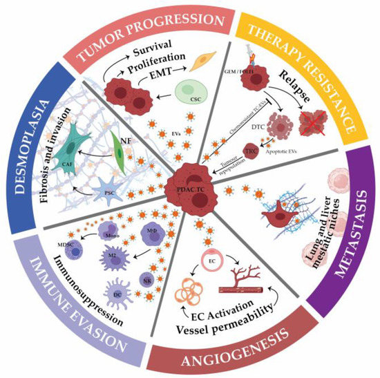Other less frequent populations of immune cells are concurrently investigated, including mast cells (MCs), another heterogeneous immune population largely involved in IgE-activated allergic inflammatory reactions. In cancer, they are known to have either pro-, through the secretion of angiogenic factors, or anti-tumorigenic effects, by initiating an immune response, depending on the type of cancer and their localization with respect to the tumor. To date, only one study has highlighted the effects of PDA tumor cells derived-EVs on MCs, resulting in their activation via EV-cell membrane receptor-mediated activation of ERK-1,2 signaling, leading to the upregulation of tissue-remodeling genes and the secretion of IL-6, IL-8, and VEGF [137]. However, the after-effects of MC activation in tumor progression and therapy resistance are largely unknown. The humoral immune response in cancer is also an area of interest, with limited knowledge of its effects in facilitating an anti-tumor response via tumor-derived EVs. B lymphocytes are responsible for the production and secretion of autoantibodies targeting tumor-associated antigens (TAA), which appear preceding neoplasia, not based on protein mutations but the localization and post-translational modifications of such proteins within tumor cells. Tumor cell-derived EVs are a reservoir for TAAs, highly represented on the surface membrane of EVs and are targets of freely circulating anti-TAA autoantibodies in the plasma of PDA patients. As with TEDCs, many studies have pointed to the efficacy of inducing an immune response with exosome-bound TAAs as opposed to the soluble form in order to activate T lymphocytes and allow the production of autoantibodies effectively. Tumor cell derived-EVs sequester circulating autoantibodies via their strong expression of TAAs and thus inhibit complement-mediated and autoantibody-based cytotoxicity [138]. These PDA patient autoantibodies are more specifically reactive to tumor exosomes than normal ones, emphasizing the role of EVs as bait for humoral immunity and ultimately protecting tumor cells from death.