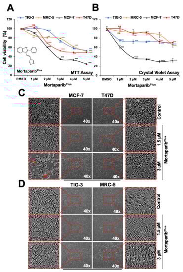 Cytotoxicity testing of MortaparibPlus against both breast cancer cells and normal lung fibroblasts was performed through the quantitative colorimetric MTT assay. In this method, the cell viability is estimated by the conversion of the yellow 3-(4,5-dimethylthiazol-2-yl)-2,5-diphenyltetrazolium bromide salt (MTT) (Sigma Aldrich, Meguro, Japan) to the purple formazan crystals by cells’ mitochondrial dehydrogenases. Cells were seeded at an approximate density of 3000–4000 cells per well in 96-well plates and cultured for 24 h in a humidified incubator (37 °C and 5% CO2) to attach and recover from the harvest stress. Then, five working concentrations of MortaparibPlus (1 μM, 2 μM, 3 μM, 4 μM and 5 μM) were freshly prepared in the complete culture medium. The next day, cells were treated with these concentrations (at least three technical replicas for each concentration). After 48 h incubation period, MTT (0.5 mg/mL) was added to the cell culture medium and the incubation time was extended for another 4 h. MTT-containing-cell culture medium was replaced with 100 μL of Dimethyl Sulfoxide (DMSO), and plates were shaken for 5 min to completely dissolve the formed formazan crystals. The optical density was measured at 570 nm using a spectrophotometer (Tecan infinite M200® Pro, Tecan, Mannedorf, Switzerland). Finally, the percentage viability related to the DMSO vehicle control was measured using the following equation []: