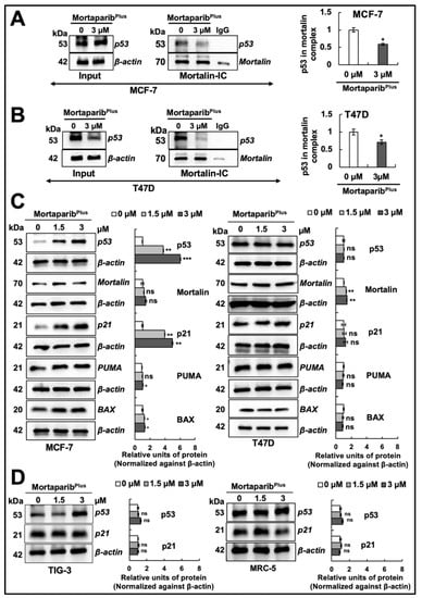 MortaparibPlus abrogated the interaction of mortalin with p53 in vitro causing the reactivation of the wild-type p53 signaling. Co-immunoprecipitation (Co-IP) analyses using a rabbit monoclonal anti-mortalin antibody (A,B) showed a decrease in p53 fractions (wild type and mutant) in mortalin complexes immunoprecipitated from MortaparibPlus-treated cells. Full uncropped blots for the Co-IP experiments are shown in Supplementary Figures S5 and S6. Control and 48 h-MortaparibPlus-treated cells were analyzed for the expression levels of p53, mortalin and several p53 downstream target genes by Western blotting (C). An accumulation in p53 levels with the overexpression of its downstream target genes (p21WAF1, PUMA and BAX) was observed in 48 h-MortaparibPlus-treated MCF-7, but not T47D, cells as compared to the untreated control. Control and MortaparibPlus-treated normal lung fibroblasts were analyzed for the expression levels of p53 and p21 by Western blotting (D). TIG-3 and MRC-5 normal lung fibroblasts also did not show a significant increase in p53 or its downstream effector p21WAF1. Full uncropped blots for the Western blotting experiments are shown in Supplementary Figures S7–S14. The quantified data represent mean ± SD obtained from independent biological replicates; p-values were calculated using unpaired Student’s t-test. ns > 0.05, * ≤0.05, ** ≤0.01 and *** ≤0.001 represent non-sgnificant, significant, very significant and highly significant, respectively.