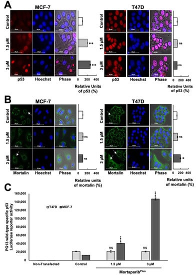 Several experiments on expression analyses by Western blotting showed the stabilization and accumulation of wild-type p53 protein in MortaparibPlus-treated MCF-7 as compared to the untreated control (Figure 2C). On the other hand, the mutant p53 protein was intrinsically accumulated in the control untreated T47D cells, as previously reported [], and there were no significant changes in its accumulation level in response to MortaparibPlus treatment (Figure 2C). Interestingly, the p53 downstream effector gene p21WAF1 (the major regulator of p53-mediated cell cycle arrest) was remarkably upregulated only in MortaparibPlus-treated MCF-7 cells. MortaparibPlus-treated T47D cells did not show a change in p21WAF1 (Figure 2C). On the other hand, the level of proteins directly involved in apoptosis (BAX and PUMA) showed a minor increase in MortaparibPlus-treated MCF-7, but not T47D, cells (Figure 2C,D). We also performed a similar expression assay on normal lung fibroblasts. As shown in Figure 2D (representative Western blot and quantitation obtained from three independent sets of experiments), MortaparibPlus did not cause any remarkable difference in the expression level of p53 or its downstream effector p21WAF1 in either TIG-3 or MRC-5 cells. We next examined the sub-cellular localization of the accumulated p53 protein and the mortalin staining pattern in control and MortaparibPlus-treated cells by immunocytochemistry. As shown in Figure 3A, whereas p53 staining was negligible in the control untreated MCF-7 (p53WT) cells, MortaparibPlus-treated cells showed clear p53 enrichment in the nuclei. On the other hand, T47D cells showed almost equal intensity of mutant p53L194F in the nuclei of both the untreated and treated cells. Of note, as shown in Figure 3B, the shift in mortalin staining pattern from perinuclear in control to pan-cytoplasmic in treated cells was confirmed in both MCF-7 and T47D cells. Furthermore, we performed p53 wild-type specific luciferase reporter (PG13-Luc) assay to determine the transcriptional activation function of p53. As shown in Figure 3C, the wild-type p53-dependent luciferase reporter activity showed a dramatic increase in MortaparibPlus (both 1.5 μM and 3 μM)-treated MCF-7, but not T47D, cells. Taken together, these data suggested that MortaparibPlus abrogated mortalin–p53 interactions in MCF-7 as well as T47D cells (Figure 2A,B); however, only MCF-7 (wild type p53) showed stimulation of the transcriptional activation function of p53.