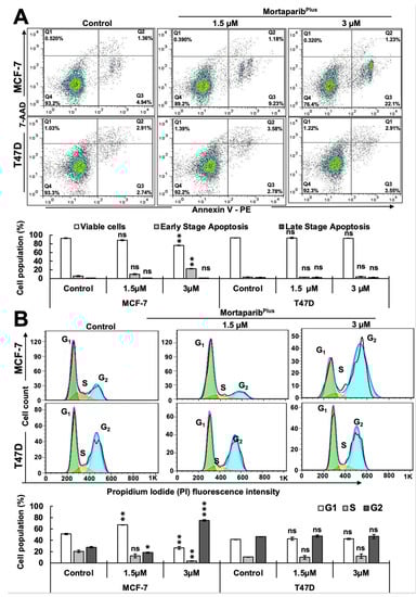 MortaparibPlus induced apoptosis and G2/M cell cycle arrest only in the wild type p53- harboring Luminal-A breast cancer cells. Flow cytometric analyses for control and 48 h MortaparibPlus-treated cells showed an increase in the early apoptotic cell populations in MortaparibPlus-treated MCF-7, but not T47D, cells (A). Using the same flow cytometric platform, cell cycle progression analyses for control and 48 h-MortaparibPlus-treated cells revealed that MortaparibPlus (3 μM) induced a strong G2/M cell cycle arrest in MCF-7 cells; MortaparibPlus-treated T47D cells were not arrested at either G1/S or G2/M cell cycle phases (B). The quantified data represent mean ± SD obtained from independent biological replicates; p-values were calculated using unpaired Student’s t-test. ns > 0.05, * ≤0.05, ** ≤0.01, and *** ≤0.001 represent non-significant, significant, very significant, and highly significant, respectively.