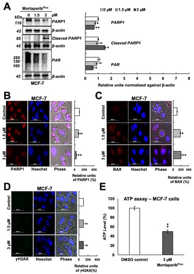 MortaparibPlus-treated Luminal-A breast cancer cells (MCF-7 (p53WT)) showed the molecular hallmarks of apoptosis. The levels of the full-length PARP1, the cleaved 89-kDa fragment of PARP1 and PAR polymer were analyzed in control and 48 h-MortaparibPlus-treated MCF-7 cells by Western blotting (A). The levels of the full-length PARP1, BAX and the phosphorylated H2A histone variant X (γH2AX) proteins were measured by immunocytochemistry (B–D). A decrease in the levels of the full-length PARP1 and PAR polymer were observed in MortaparibPlus-treated cells as compared to the untreated control. An increase in the 89-kDa cleaved fragment of PARP1 and BAX protein was observed in the MortaparibPlus-treated MCF-7 cells if compared to the untreated control. Total cellular ATP concentrations in DMSO control and MortaparibPlus-treated MCF-7 cells were measured using a luminescent ATP detection method (E). ATP levels were decreased in MortaparibPlus-treated MCF-7 cells compared to the control untreated cells. Scale bar: 50 μm. Full uncropped blots for the Western blotting experiments are shown in Supplementary Figures S15 and S16. The quantified data represents mean ± SD obtained from independent biological replicates; p-values were calculated using unpaired Student’s t-test. ns > 0.05, * ≤0.05 and ** ≤0.01 represent non-significant, significant, and very significant, respectively.