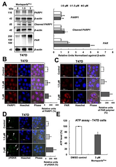 Furthermore, as shown in Figure 5A, a decrease in the levels of PAR polymer was detected with an increase in the 89-kDa cleaved fragment of PARP1 in the MortaparibPlus-treated MCF-7 cells. Additionally, BAX protein (the major regulator of the p53-mediated apoptosis) showed an increase in the MortaparibPlus-treated MCF-7 cells as measured by immunocytochemistry (Figure 5C). As shown in Figure 5E, ATP levels were decreased in MortaparibPlus-treated MCF-7 cells compared to the untreated control cells. Such molecular changes in treated MCF-7 cells are typical biomarkers for the establishment of apoptosis as a cellular death fate [,]. On the other hand, as apoptosis was not initiated in the treated T47D cells (Figure 4A), the levels of PARP1 remained unchanged (Figure 6A,B). However, we interestingly observed a profound increase in the levels of PAR polymer in MortaparibPlus-treated T47D cells, both by Western blotting (Figure 6A) and immunocytochemistry (Figure 6C). We predicted that such an increase in PAR polymer could be due to the undue PARP1 catalytic activity resulting from the excessive increase in the burden of DNA damage that could be found by the immunostaining of the phosphorylated H2A histone variant X (γH2AX). As shown in Figure 6D, we indeed found a remarkable increase in γH2AX foci in the MortaparibPlus-treated T47D cells as compared to the untreated control. Such an increase was not observed in the MortaparibPlus-treated MCF-7 cells (Figure 5D). On the other hand, the latter showed a remarkable increase in ROS in MortaparibPlus treated (at 3 μM) cells (Supplementary Figure S3) and marked by the rapid induction of apoptosis (Figure 4A). Of note, the increase in ROS was not observed either in T47D or the normal fibroblasts (Supplementary Figure S3). Independent Western blotting and immunocytochemistry assays also revealed a lack of change in the levels of γH2AX between control and MortaparibPlus-treated TIG-3 and MRC-5 normal lung fibroblasts (Supplementary Figure S4). Taken together, these data supported the idea that the accumulation of DNA damage that did not trigger either the growth arrest or apoptosis, was unique in MortaparibPlus-treated T47D cells.
