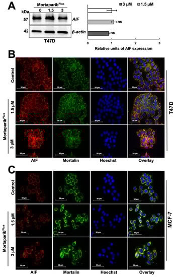MortaparibPlus treated cells did not show translocation of apoptosis-inducing factor (AIF) to the nuclei. AIF’s expression level in control and 48 h MortaparibPlus-treated T47D cells was examined by Western blotting (A). There were no significant changes in AIF’s expression levels in control and MortaparibPlus-treated T47D cells. AIF’s subcellular localization in control and 48 h-MortaparibPlus-treated T47D and MCF-7 cells was analyzed by immunocytochemistry. Co-localization of mortalin and AIF was observed in T47D cells (B). MCF-7 cells showed a low level of expression of AIF as compared to T47D cells; its colocalization with mortalin was observed and more prominent in MortaparibPlus-treated cells (C). Full uncropped blots for the Western blotting experiments are shown in Supplementary Figure S18. Scale bar: 50 mm. The quantified data represent mean ± SD obtained from independent biological replicates; p-values were calculated using unpaired Student’s t-test. ns > 0.05 represents non-significant.