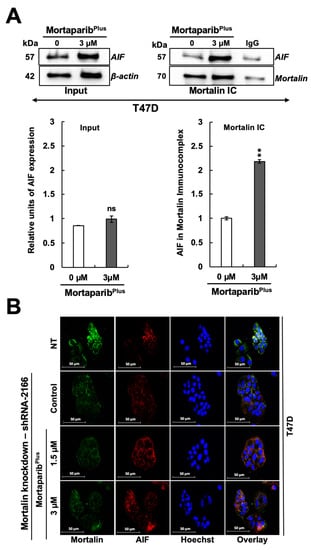 PAR polymer has been reported as a death signal molecule [], and its accumulation is considered as a hallmark for PAR-Thanatos or PARP1-mediated cell death []. As PAR-Thanatos is mainly characterized by the cellular depletion of ATP levels and translocation of the mitochondrial apoptosis-inducing factor (AIF) to the nucleus for inducing chromatin condensation and DNA degradation [], we examined the ATP levels and both AIF expression and subcellular localization in control and MortaparibPlus-treated T47D cells. As shown in Figure 6E, although apoptosis was not initiated in the MortaparibPlus-treated T47D cells, total cellular ATP levels showed a decrease as compared to the control vehicle-treated cells. We next examined the AIF levels in the control and MortaparibPlus-treated T47D cells and found that there was no significant change in AIF’s expression level in the treated T47D cells (Figure 7A). Interestingly, as shown in Figure 7B, AIF was not translocated to the nucleus after the MortaparibPlus-mediated PAR accumulation in T47D cells. As previously reported [,,,], mortalin hinders the translocation of AIF to the nucleus (as shown in Figure 7B, AIF and mortalin colocalization is marked by yellow co-staining in the cytoplasm). These data revealed that in spite of PAR accumulation and the decrease in ATP levels, AIF was not translocated to the nucleus in MortaparibPlus-treated T47D cells (Figure 7B). MCF-7, as compared to T47D, cells showed a lower level of AIF protein. However, MortaparibPlus treatment caused an increase in AIF (Figure 7C). As shown in Figure 8A, co-immunoprecipitation of mortalin and AIF from control and MortaparibPlus-treated T47D cell lysates revealed an increase in AIF in mortalin immunocomplexes in the later. These data suggested that MortaparibPlus could not abrogate the interaction between mortalin and AIF confirming the mortalin-mediated cytoplasmic sequestration of AIF in control and MortaparibPlus-treated T47D cells. As shown in Figure 2C, MortaparibPlus-treated T47D cells showed a small increase in mortalin expression as compared to the untreated cells. Since such an increase in mortalin levels could potentially be implicated in AIF’s cytoplasmic sequestration, we next examined if mortalin knockdowns by mortalin specific shRNA (shRNA2166) could relocate AIF to the nucleus in these cells. As shown in Figure 8B, mortalin knockdown was not enough to liberate AIF from mortalin complex even after the MortaparibPlus-induced PAR accumulation.