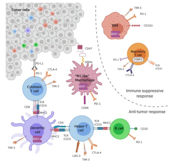 The immune checkpoints that have an inhibitory effect on the immune system and play a role in STSs include the receptor PD-1 and its ligand PDL1, the enzyme 2,3-dioxygenase (IDO), the T cell immunoglobulin and mucin domain 3 receptor TIM3 and its ligand galectin-9 (Gal9), the lymphocyte activation gene-3 receptor (LAG3) and its ligand MHC II, and the receptor signal regulatory protein α (SIRPα) and its ligand CD47.