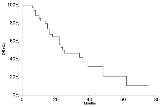 All patients continued the treatment according to the ISG/AIEOP EW-2 study protocol. The EFS rate at 3 years was 20.9% (95% CI 6.3–35.6) (Figure 1). The 3-year EFS probability appeared to be significantly higher in patients who experienced PR + SD (23%, 95% CI 7.1–38.8%) than in those who did not (0%, p-value = 0.007). The OS rate at 3 years was 36.5% (95% CI 18.4–54.6%) (Figure 2). At the time of the present analysis, 11 patients are alive and 7 are in complete remission.